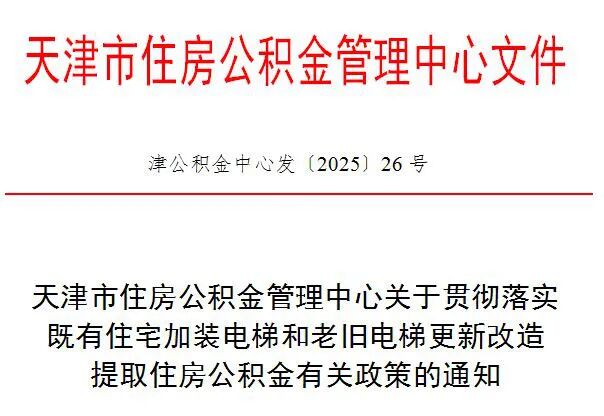 為貫徹落實我市《關於既有住宅加裝電梯和老舊電梯更新改造提取住房公積金有關政策的通告》(津政規〔2025〕4號),現將既有住宅加裝電梯和老舊電梯更新改造提取住房公積金的范圍、資料等通知如下: